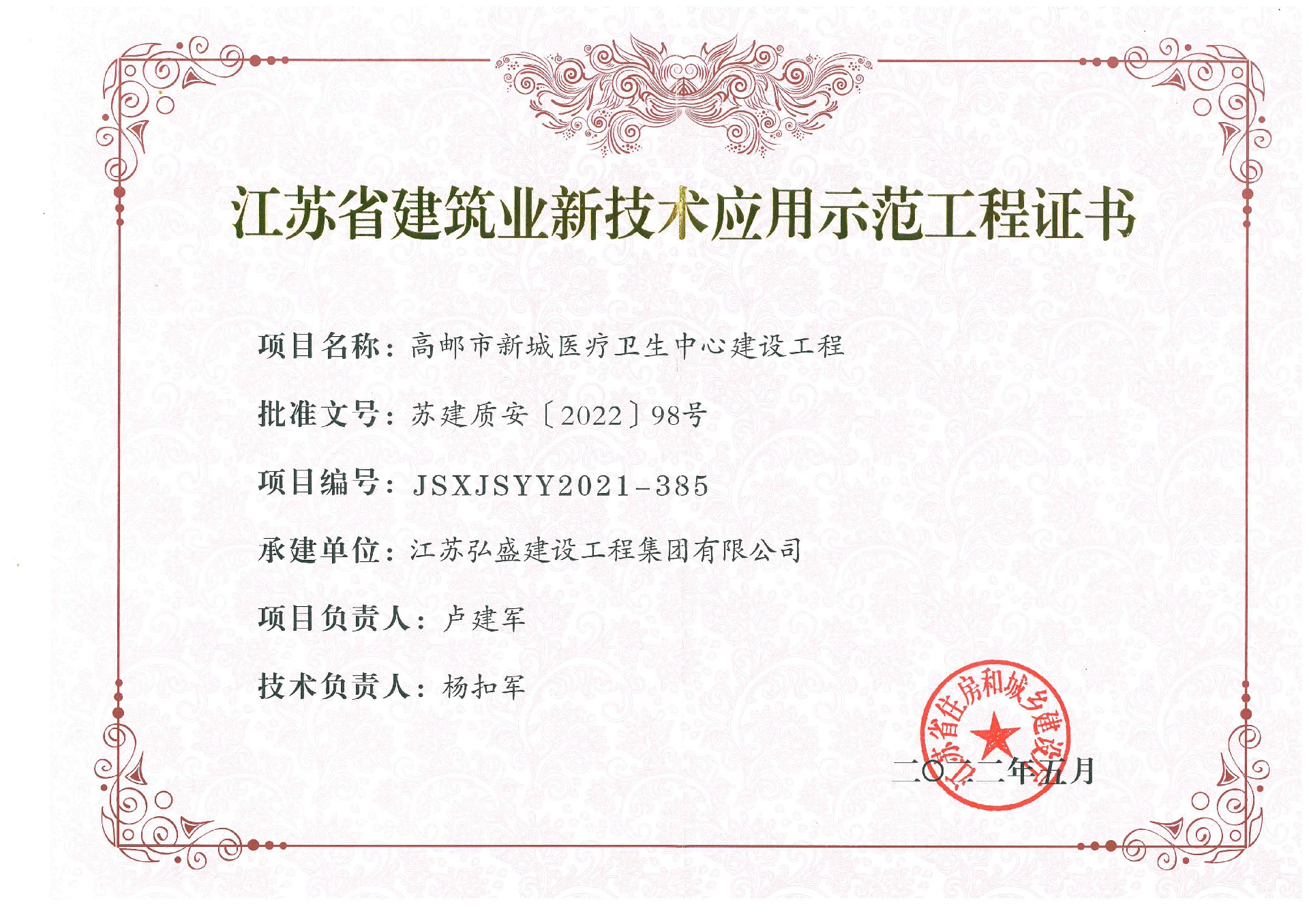 高邮市新城医疗卫生中心建设工程获得“江苏省建筑业新技术应用示范工程”奖