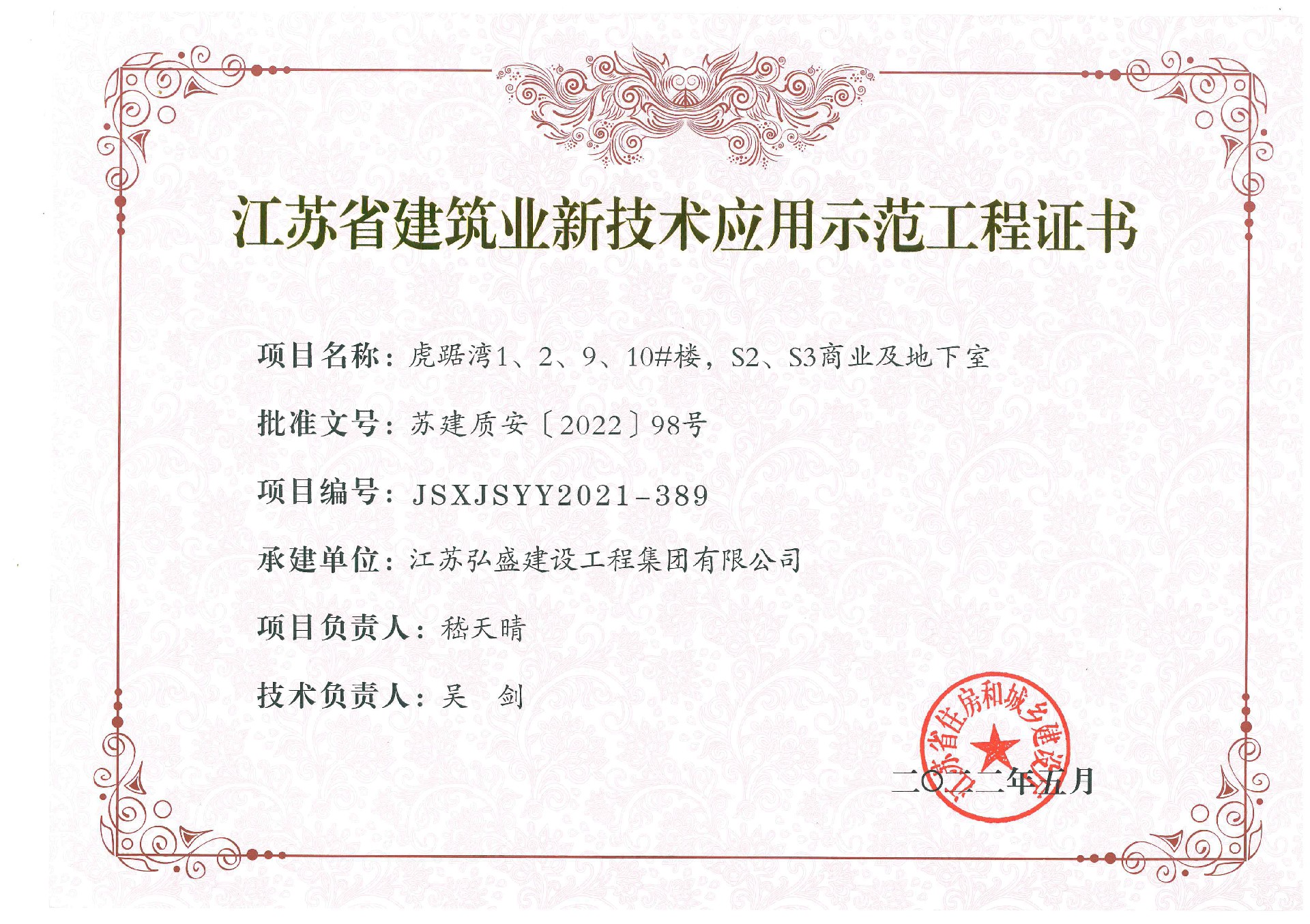 虎踞湾1、2、9、10#楼,S2、S3商业及地下室项目获得“江苏省建筑业新技术应用示范工程”奖