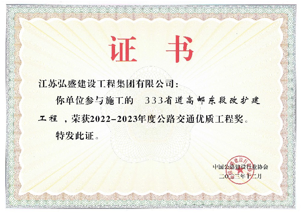 333省道高邮东段改扩建工程荣获2022-2023年度公路交通优质工程奖