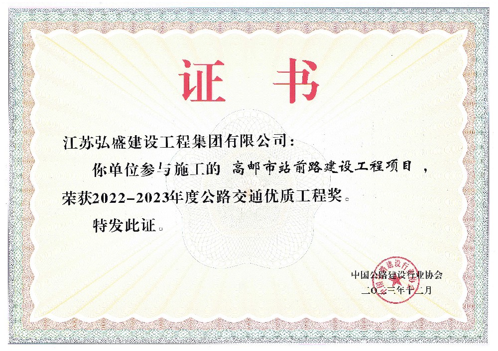 高邮市站前路建设工程项目荣获2022-2023年度公路交通优质工程奖