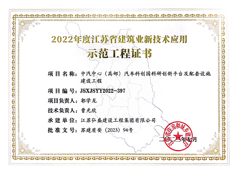 中汽中心(高邮)汽车科创园科研创新平台及配套设施建设工程荣获2022年度江苏省建筑业新技术应用示范工程