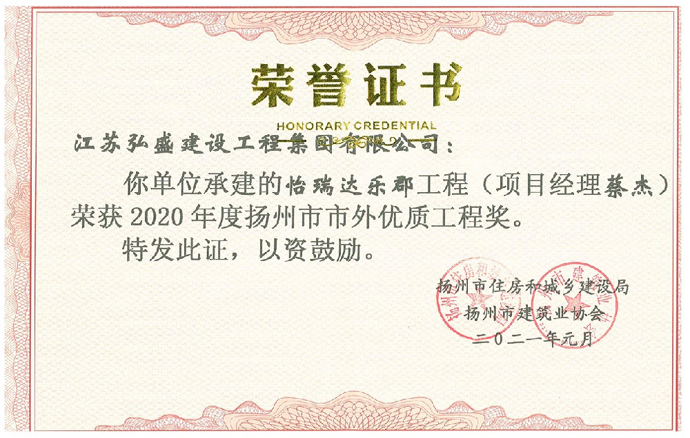 怡瑞达乐郡工程荣获2020年度扬州市市外优质工程奖
