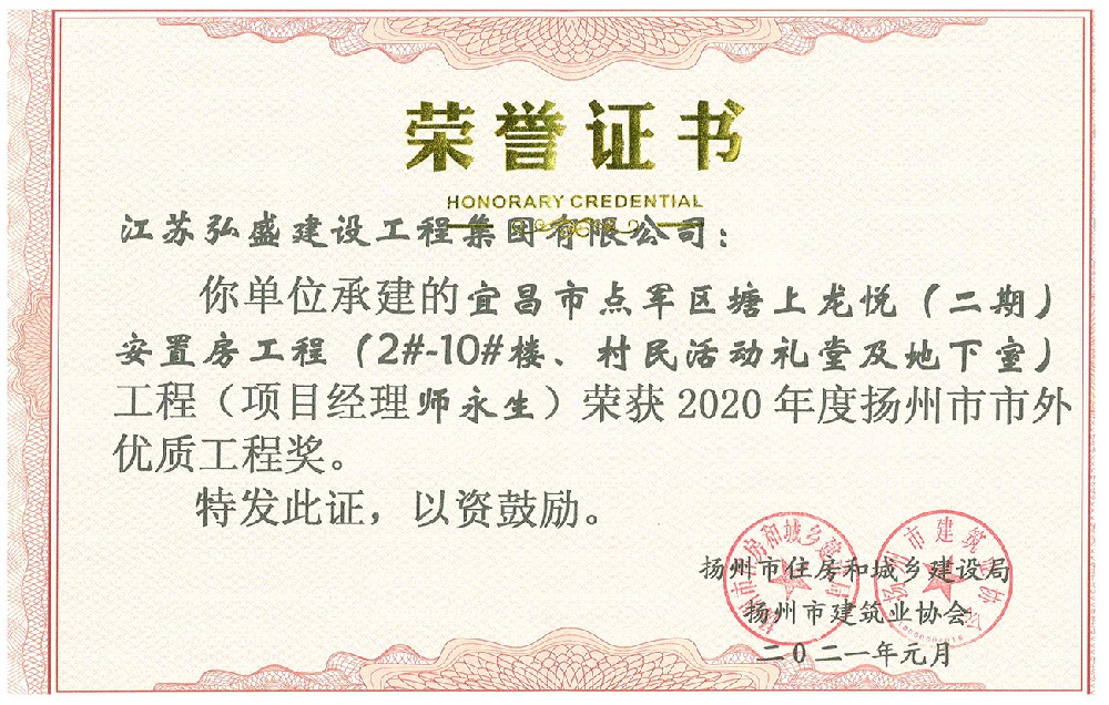 龙乐华府工程荣获2020年度扬州市市外优质工程奖