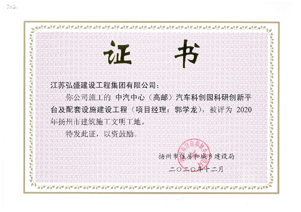 中汽研项目荣获2020年度扬州市建筑施工文明工地