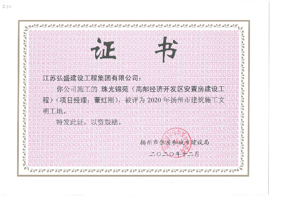 珠光锦苑荣获2020年度扬州市建筑施工文明工地