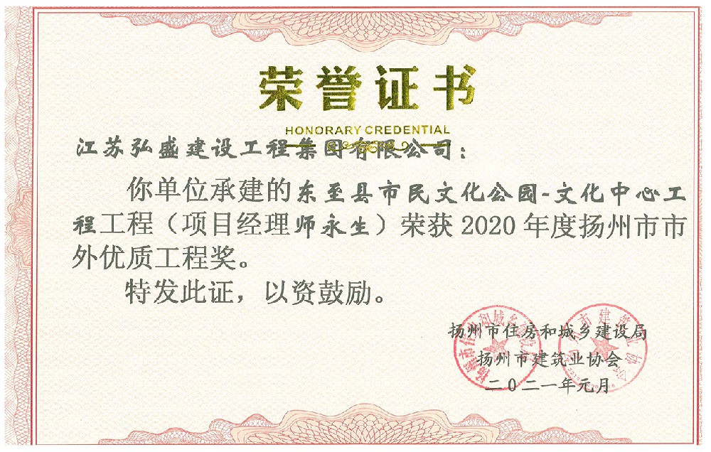 东至县市民文化公园-文化中心工程荣获2020年度扬州市市外优质工程奖