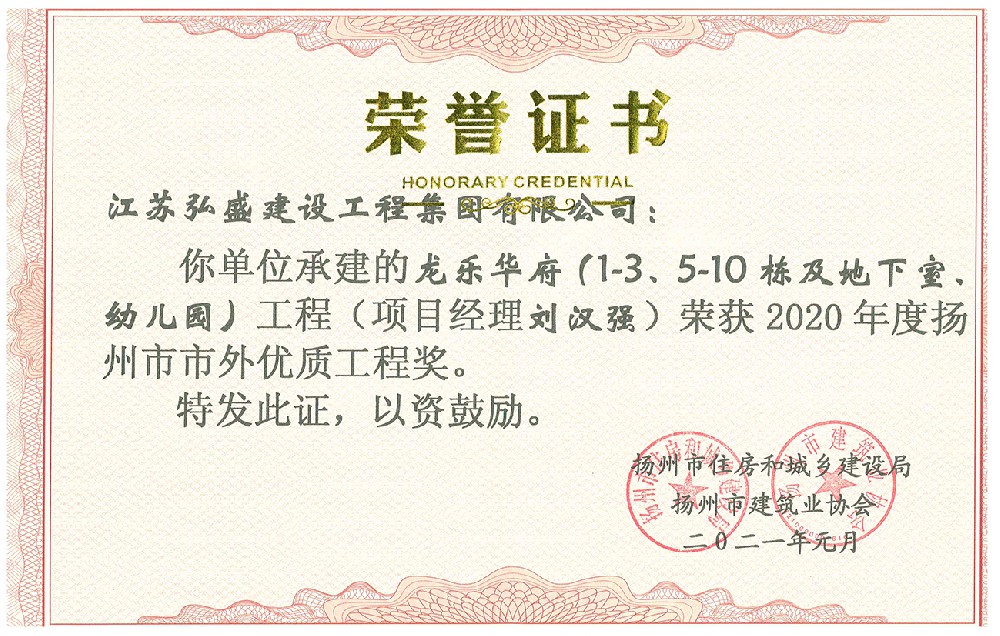 龙乐华府工程荣获2020年度扬州市市外优质工程奖