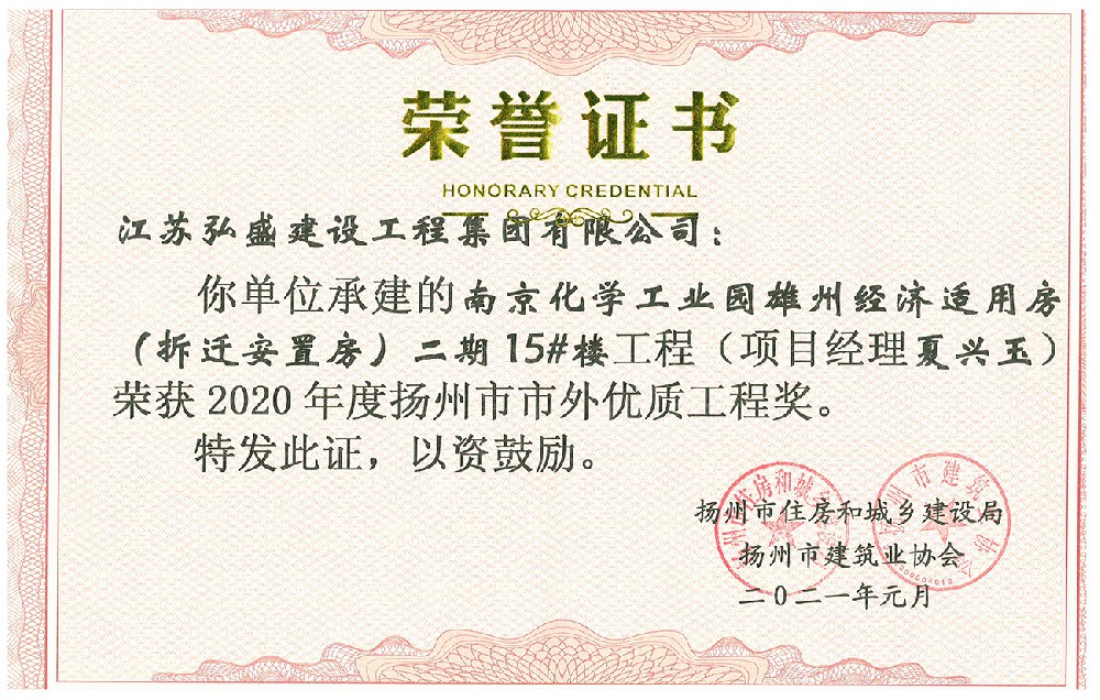 南京化学工业园雄州经济适用房工程荣获2020年度扬州市市外优质工程奖