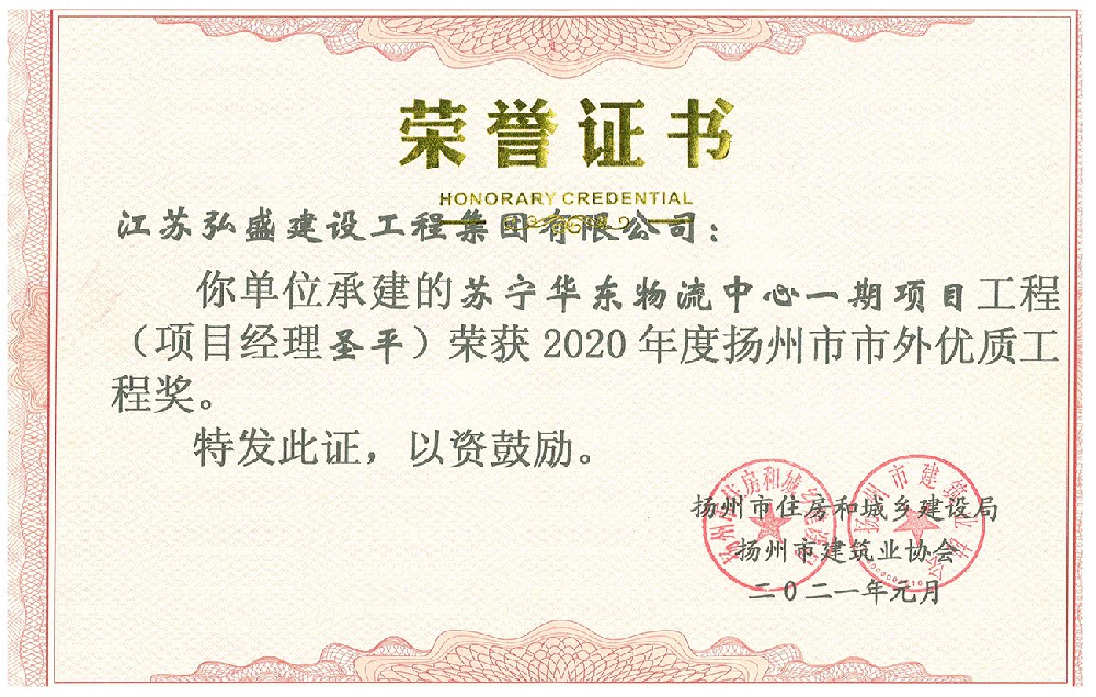 苏宁华东物流中心工程荣获2020年度扬州市市外优质工程奖
