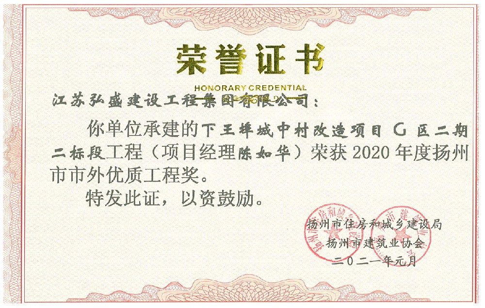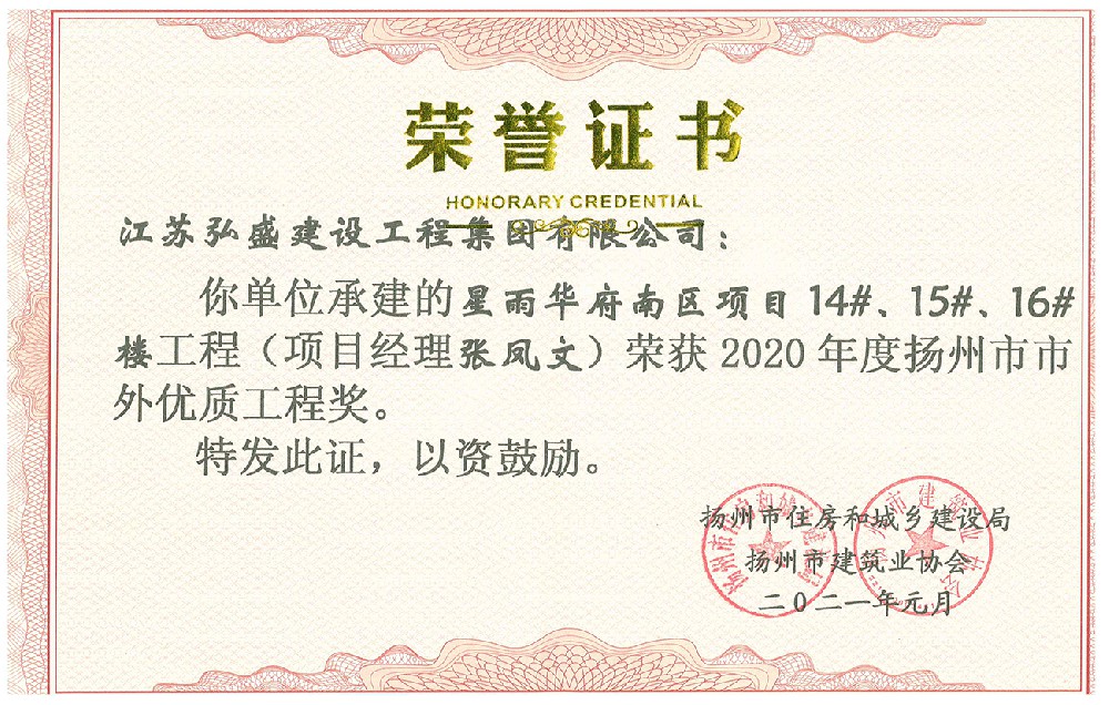 星雨华府南区工程荣获2020年度扬州市市外优质工程奖