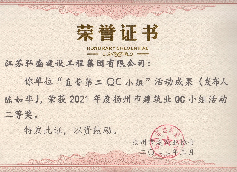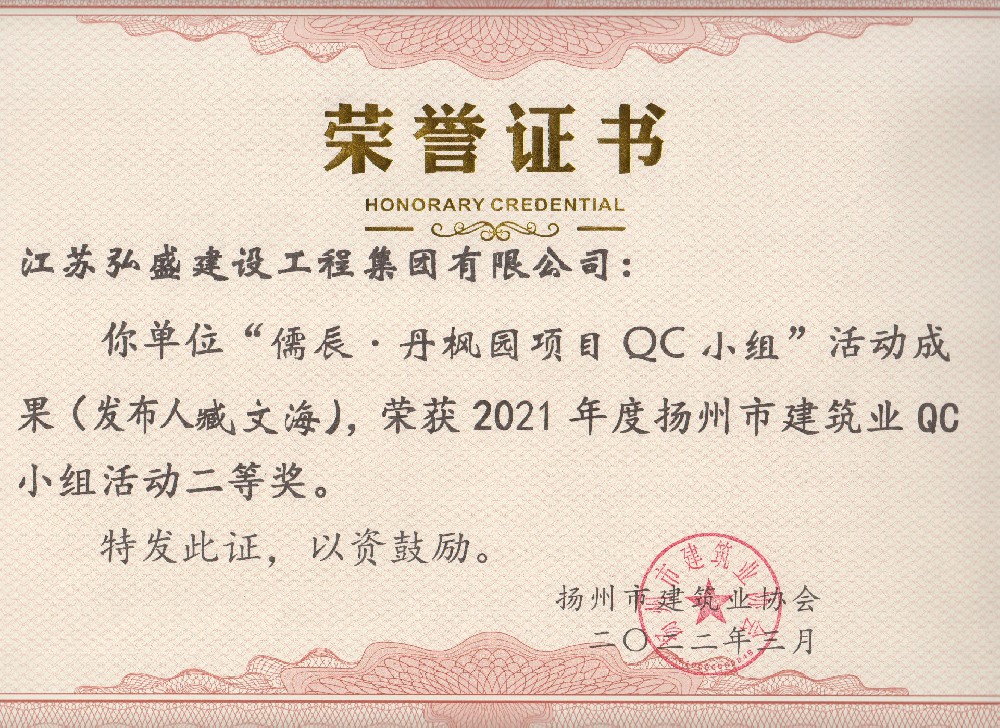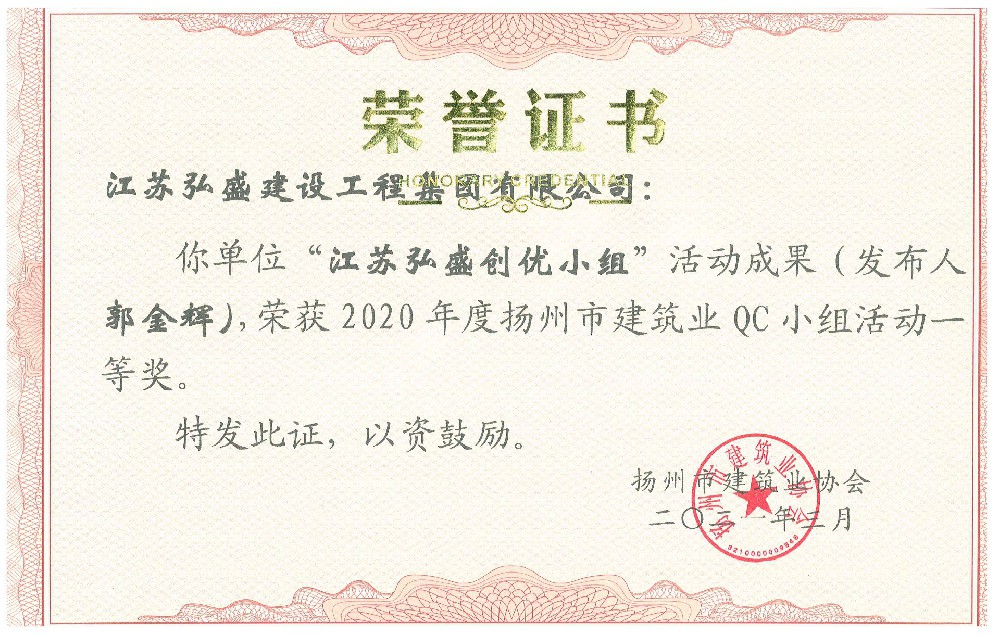 “江苏弘盛集团质量创优小组”荣获2020年度扬州市建筑业QC小组活动一等奖