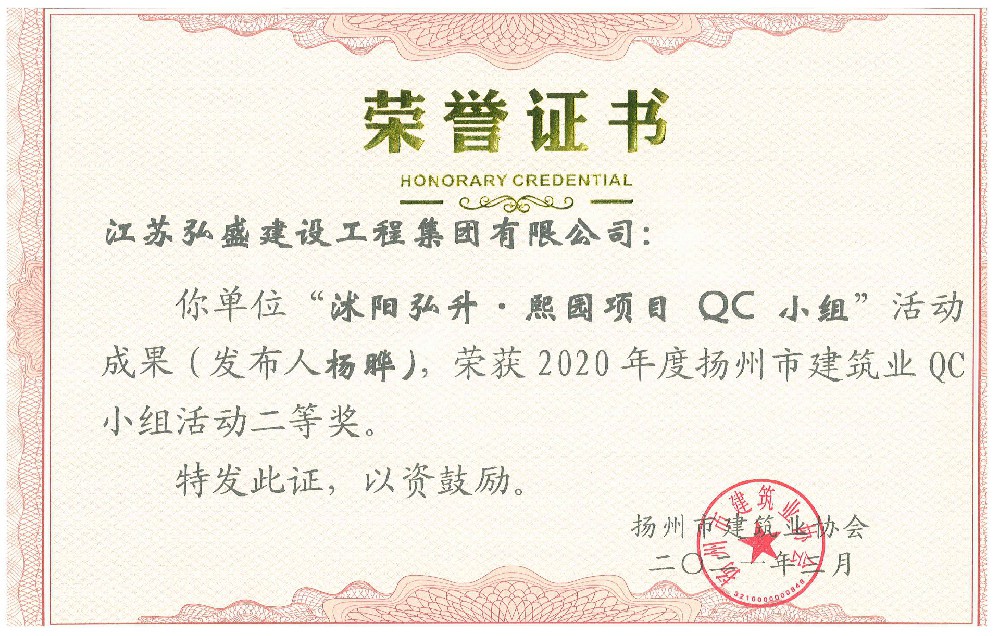 “沭阳弘升熙园项目QC小组”荣获2020 年度扬州市建筑业QC小组活动二等奖