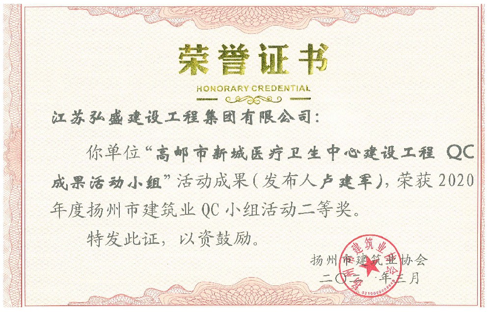 “高邮市新城医疗卫生中心建设工程QC小组”荣获2020年度扬州市建筑业QC小组活动二等奖